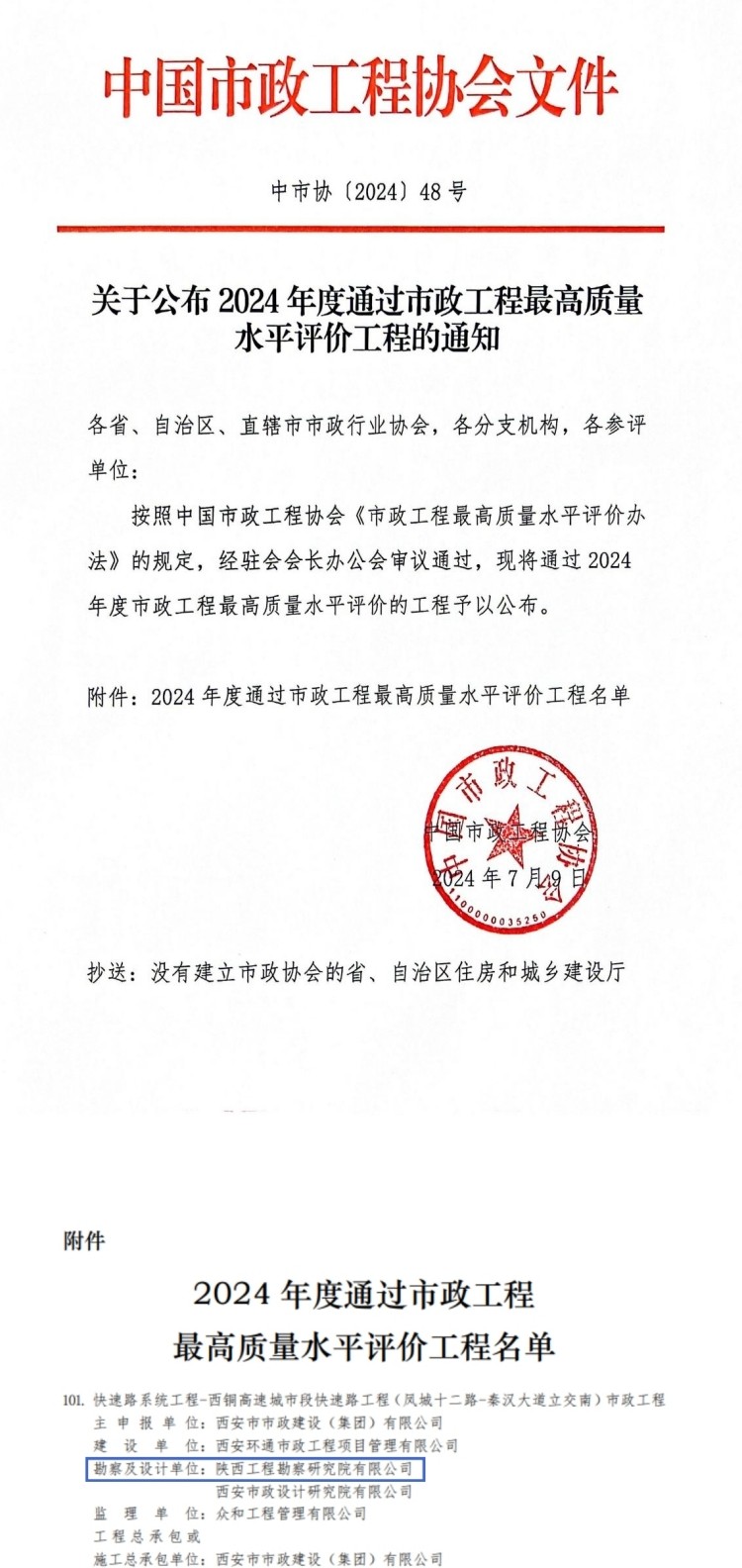 7月9日,中國市政工程協(xié)會公布了2024年度市政工程最高質(zhì)量水平評價工程名單,陜西工勘院參建項目名列其中,再次榮獲中國市政工程最高質(zhì)量水平評價。