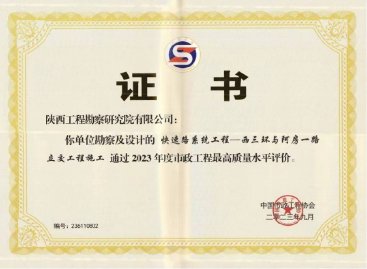 該獎項由中國市政協(xié)會組織實施,代表市政工程行業(yè)同時期國內(nèi)先進(jìn)水平,獲獎要求高,評選程序嚴(yán)格,是我國市政行業(yè)在工程質(zhì)量方面的最高榮譽。此前由我公司負(fù)責(zé)勘察的西三環(huán)與阿房一路立交工程施工項目獲2023年度市政工程最高質(zhì)量水平評價,今年西銅高速城市段快速路工程(鳳城十二路-秦漢大道立交南)市政工程又獲2024年度市政工程最高質(zhì)量水平評價。連續(xù)兩年榮獲該項“國字”榮譽,充分展示出公司近年來在勘察領(lǐng)域扎實的專業(yè)功底及人才培養(yǎng)方面取得的突出成效。
