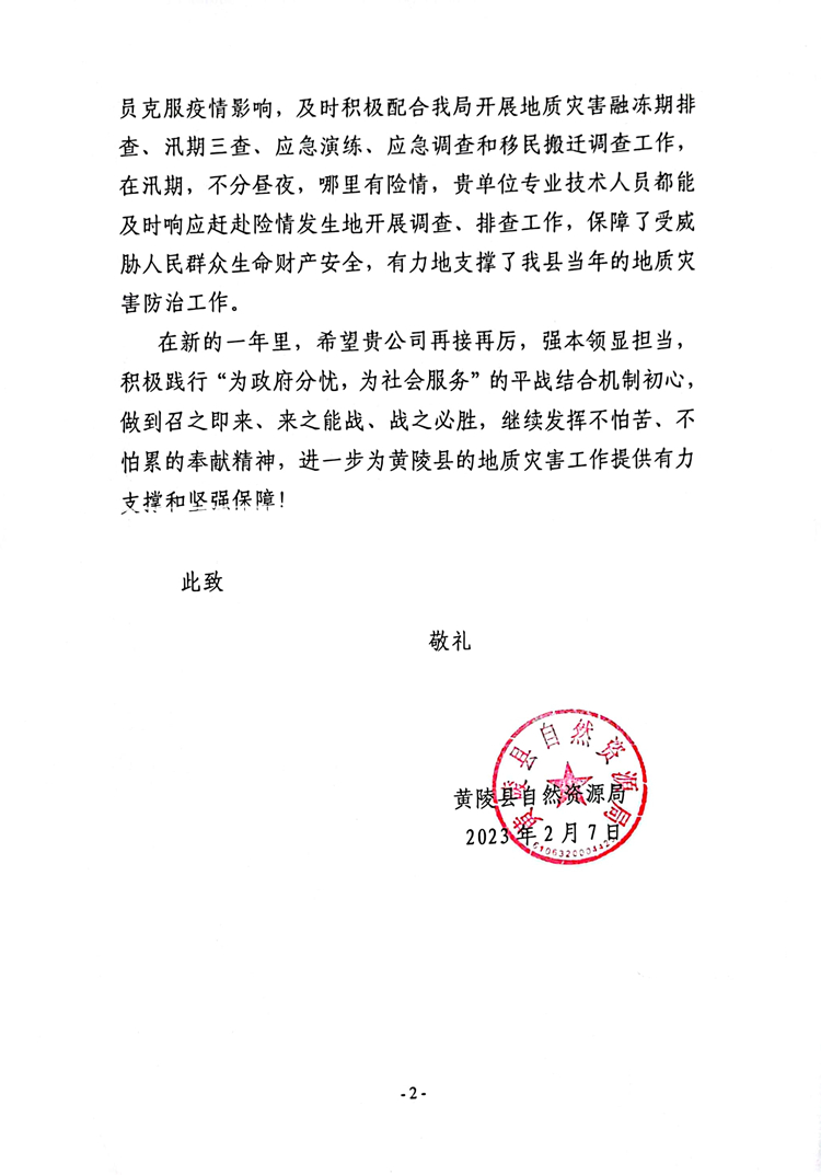 一封感謝信,紙短情長。2月17日,陜西工勘院收到一封來自黃陵縣自然資源局送來的感謝信,這對公司平戰(zhàn)結合技術支撐組各位成員來說既是“意外驚喜”又在“意料之中”,是對我公司平戰(zhàn)結合技術支撐工作的認可,更是對公司地質災害防治領域技術實力的肯定。